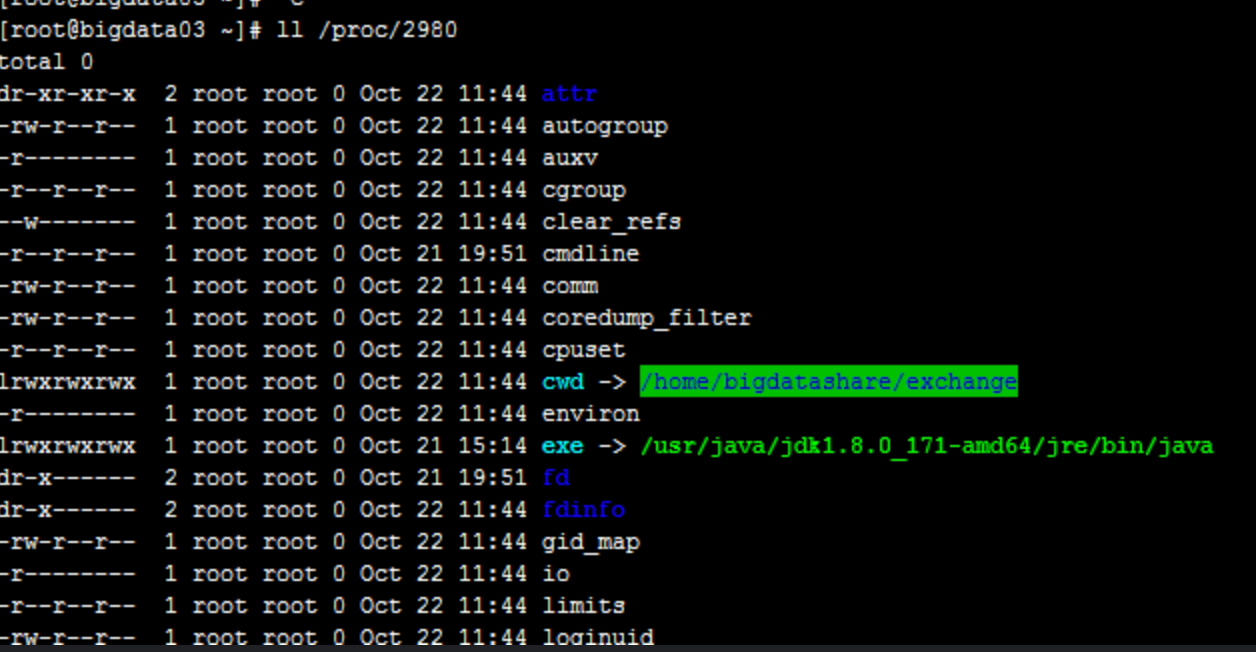 其中cwd -> /home/bigdatashare/exchange 就是文件的存放路径
