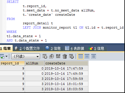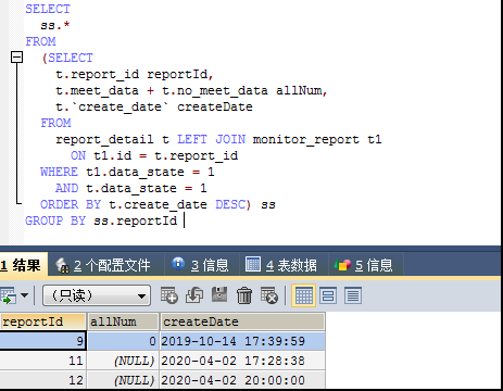 很明显,report_id为9的 数据总量是有为3的,至于为什么查出来多条,完全是执行器里面的逻辑,被调度一次就往表里塞一条数据导致的…还是就事论事,其实按这个sql 层面来理解,就是需要取出某个report_id 下最新时间点的那条数据。可惜这个sql写错了,应该先按时间倒排序 再按时间分组哈;先GROUP BY 会默认按时间正排序取出最小时间点的那条数据,不禁要问再按时间倒排序有何意义?