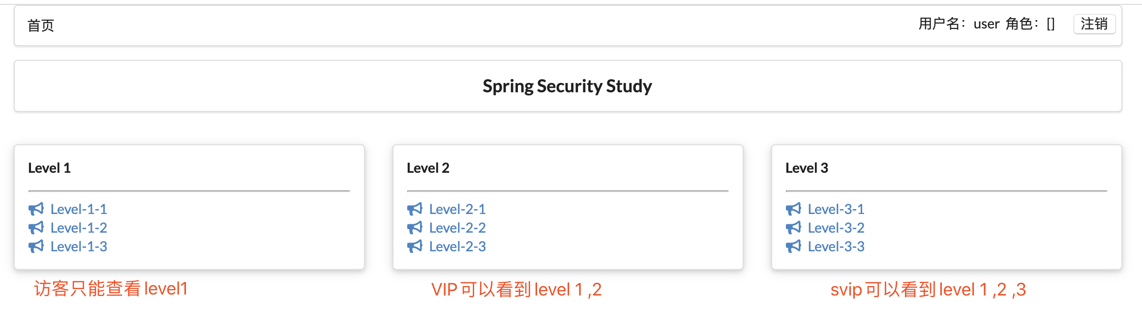 重启项目验证 可以看到3个用户,可以看到不同的模块,实现了权限的控制。 注:在我们配置注销时,可以看到springSecurity已经帮我们配置好了 当然我们实际的处理方式是不同的角色配置不同的菜单,不会这么控制!这里只是举例说明Security权限控制以及thymeleaf权限控制语法