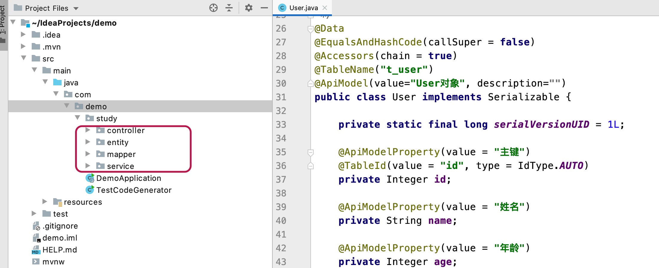 可以看到在我们的包下生成来对应的各种包,这里我只建来t_user这一张表来演示;注意代码生成器里的逻辑都是基于表的配置来写的,要保持一致不然会报错!