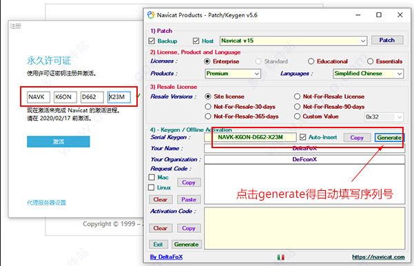 点击确定,然后点击Generate自动生成填写序列号,要自动填充到navicat 的许可证框框中,不要手动复制过去!