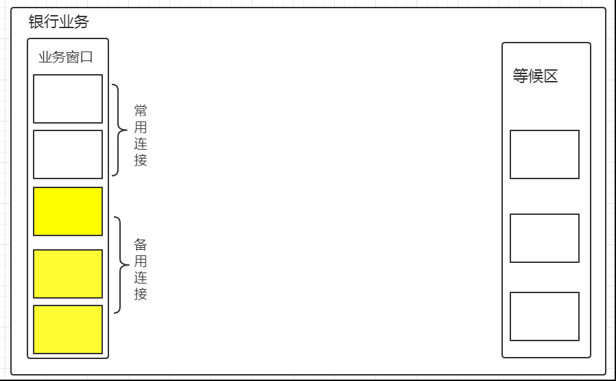 workQueue:阻塞队列,结合图来理解也就是等候区。当常用连接和等候区满了,会启用备用连接。当这些都满了,会根据拒绝策略来判定