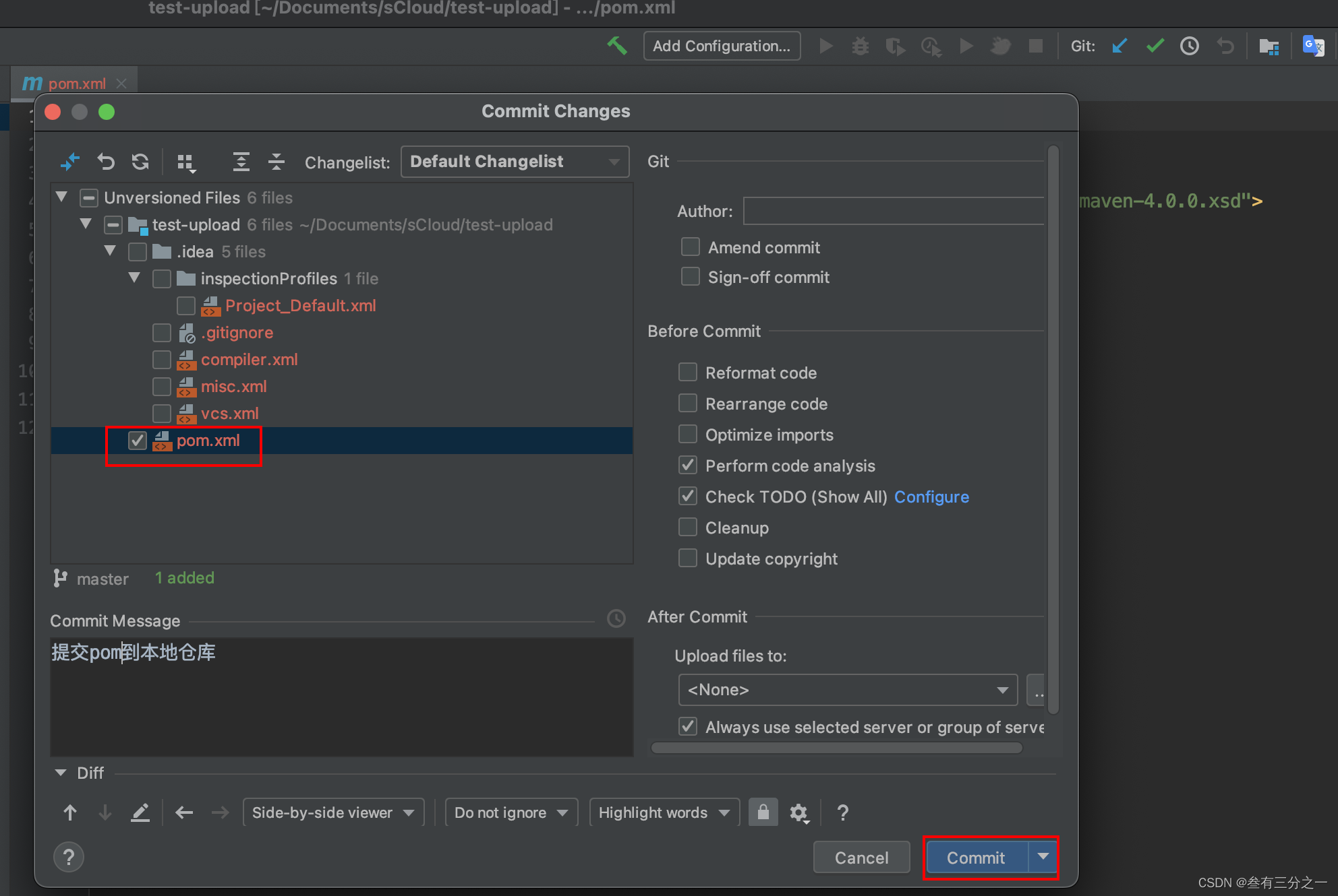 echo@echodeMacBook-Pro test-upload % git branch --set-upstream-to=origin/master #按提示执行此命令,表示和远端保持一致 分支 'master' 设置为跟踪 'origin/master'。 echo@echodeMacBook-Pro test-upload % git pull origin master #拉取远端主分支的文件 来自 https://gitee.com/viEcho/test-upload * branch master -> FETCH_HEAD 提示:您有偏离的分支,需要指定如何调和它们。您可以在执行下一次 提示:pull 操作之前执行下面一条命令来抑制本消息: 提示: 提示: git config pull.rebase false # 合并 提示: git config pull.rebase true # 变基 提示: git config pull.ff only # 仅快进 提示: 提示:您可以将 "git config" 替换为 "git config --global" 以便为所有仓库设置 提示:缺省的配置项。您也可以在每次执行 pull 命令时添加 --rebase、--no-rebase, 提示:或者 --ff-only 参数覆盖缺省设置。 致命错误:需要指定如何调和偏离的分支。 echo@echodeMacBook-Pro test-upload % git config pull.rebase false #说明有文件没有同步,配置为合并 echo@echodeMacBook-Pro test-upload % git pull origin master #在拉一次,发现是历史存在的和当前本地分支新增关联前就有的 来自 https://gitee.com/viEcho/test-upload * branch master -> FETCH_HEAD 致命错误:拒绝合并无关的历史 echo@echodeMacBook-Pro test-upload % git pull origin master --allow-unrelated-histories #表示允许没关联的文件也同步拉取 来自 https://gitee.com/viEcho/test-upload * branch master -> FETCH_HEAD Merge made by the 'ort' strategy. .gitignore | 23 +++++++++++++++++++ LICENSE | 201 +++++++++++++++++++++++++++++++++++++++++++++++++++++++++++++++++++++++++++++++++++++++++++++++++++++++++++++++++++++++++++++++++++++++++++++++++++++++++++++++ 2 files changed, 224 insertions(+) create mode 100644 .gitignore create mode 100644 LICENSE echo@echodeMacBook-Pro test-upload % git push #merge完,push 就ok了 枚举对象中: 6, 完成. 对象计数中: 100% (6/6), 完成. 使用 16 个线程进行压缩 压缩对象中: 100% (4/4), 完成.