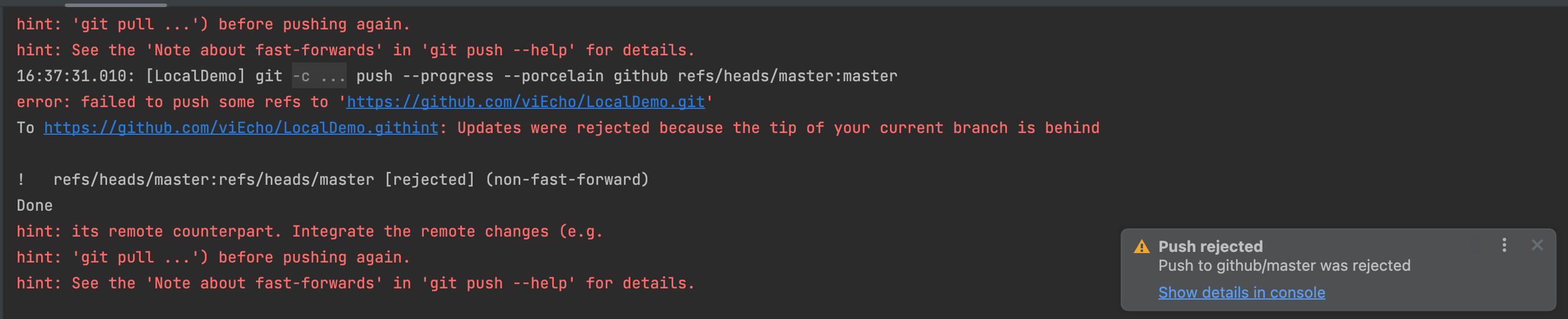 然后push,选择github,然后不出意外又要出意外了;push被拒绝了