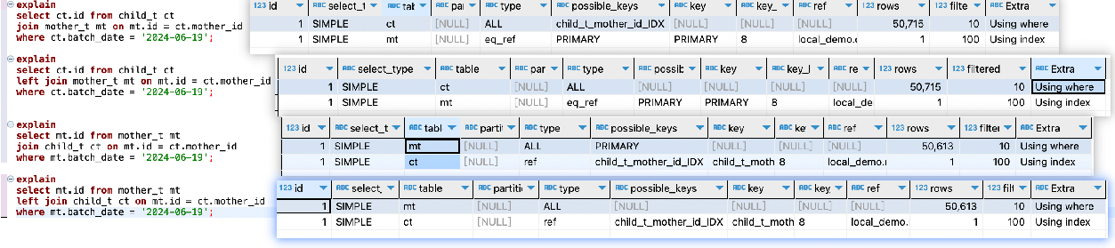 其中mother_t 表和child\_t表是1对1关系;这里有个小插曲,之前child表关联mother表是left join关联,同事说一对一的改为join关联就好了,测试环境测了下发现left join 和join 查询出来的数据量不同,但是业务肯定是要业务主表有数据的,子表没数据也不能影响主表看数;因为这边数据质量一直都不算好,所以又改回了left join;并且查看了这两张表join 和left join 查询的执行计划发现一样,所以就没放在心上;*